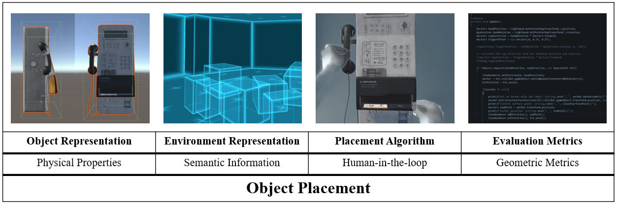 A framework for object placement in MR environments is proposed, which integrates geometric and semantic representations, a human-in-the-loop approach, and real-time interaction features.