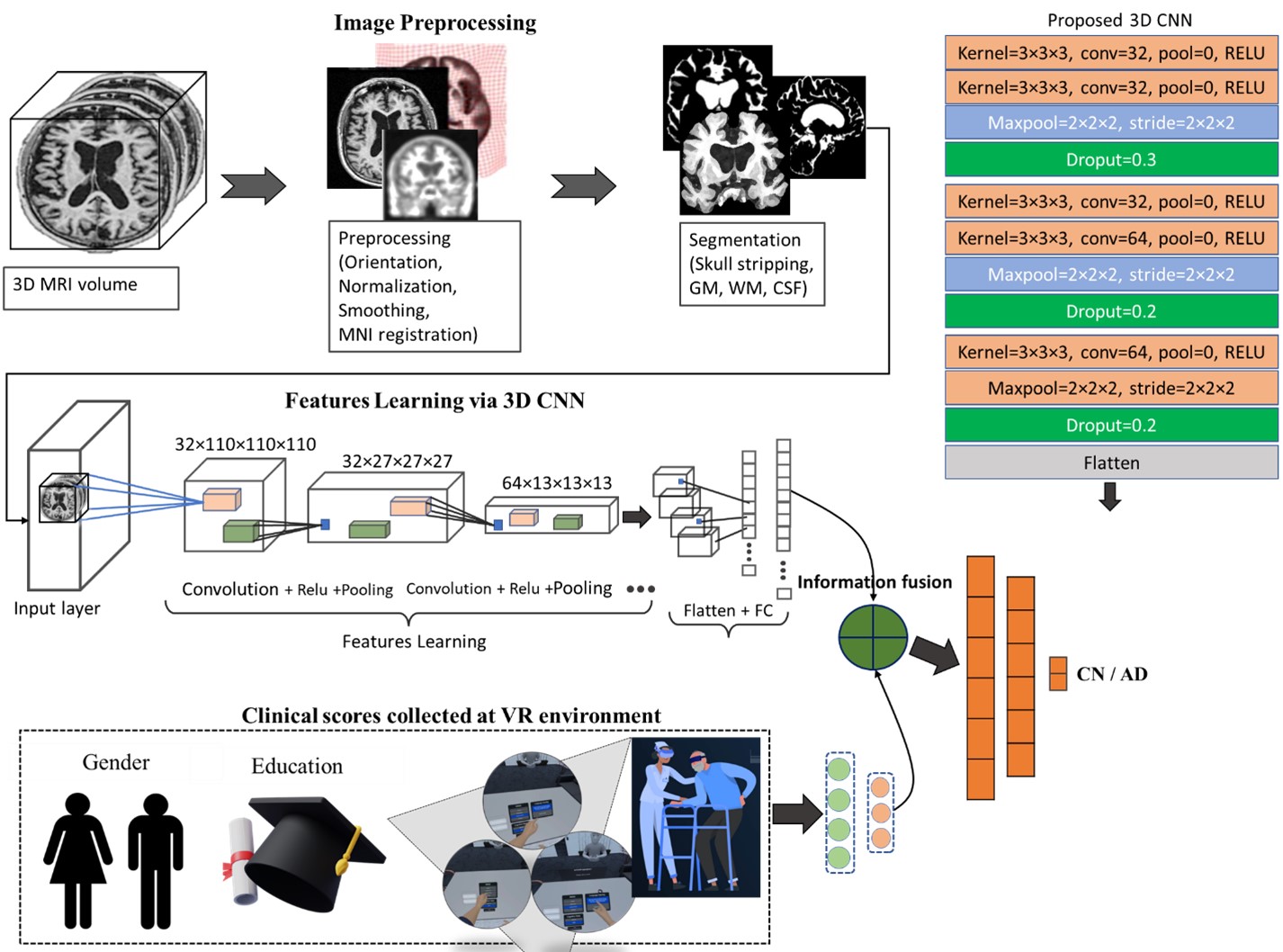 This paper tried to design a VR environment suitable for older adults in which three cognitive assessments namely: ADAS-Cog, Montreal Cognitive Assessment (MoCA), and Mini Mental State Exam (MMSE), are implemented. Moreover, a 3DCNN-ML model was trained based on the corresponding cognitive tests and Magnetic Resonance Imaging (MRI) with different modalities using the Alzheimer's Disease Neuroimaging Initiative 2 (ADNI2) dataset and incorporated into the application to predict if the patient suffers from AD.