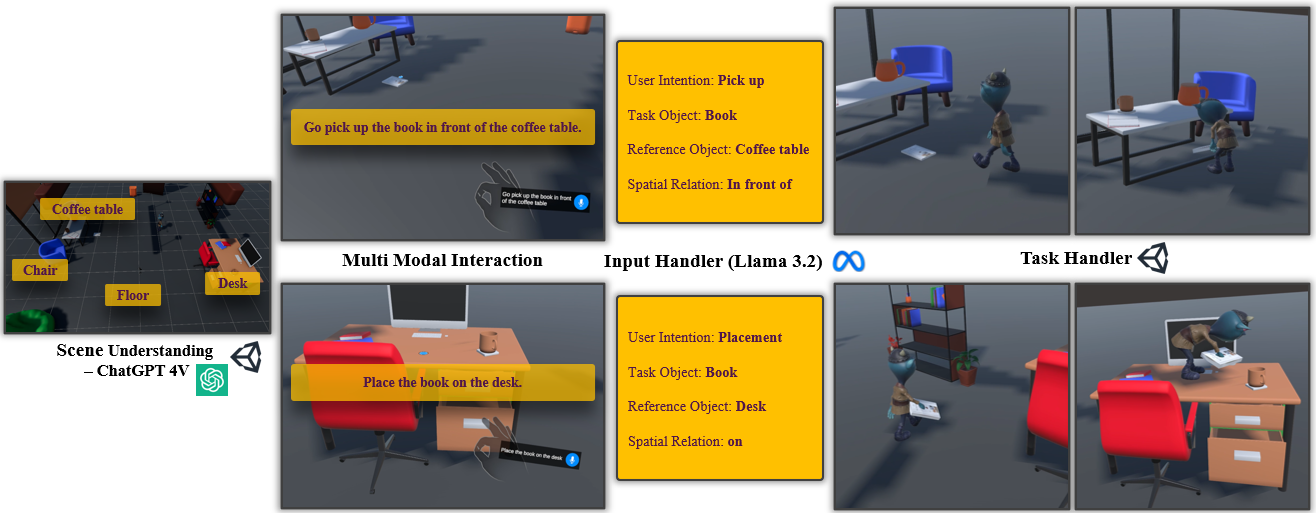 This paper presents a multi-modal human-agent interaction framework that integrates hand tracking, voice commands, user intention interpretation, and scene understanding using large language and vision models for object pick-up and placement tasks in VR. |