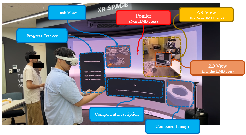 We propose a hybrid AR system integrating HMDs with a large, curved display to facilitate collaboration between an HMD user and a group of non-HMD participants—including supervisors, trainees, or audience members.
