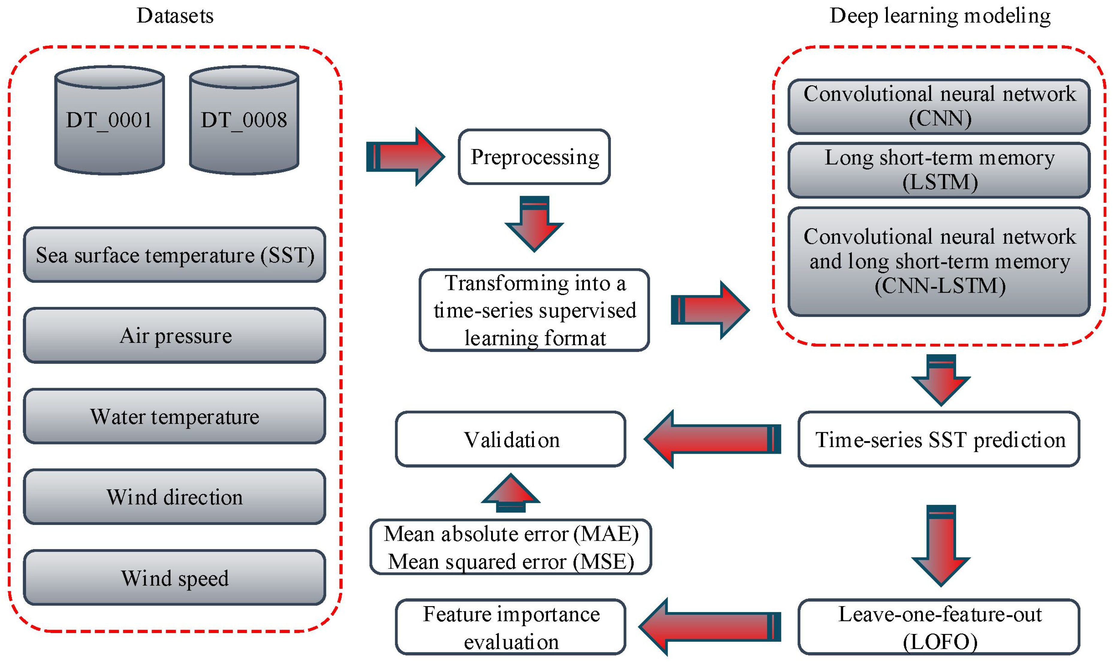 This paper utilized multi features of air pressure, water temperature, wind direction, and wind speed for time-series hourly SST prediction using deep neural networks of convolutional neural network (CNN), long short-term memory (LSTM), and CNN–LSTM.