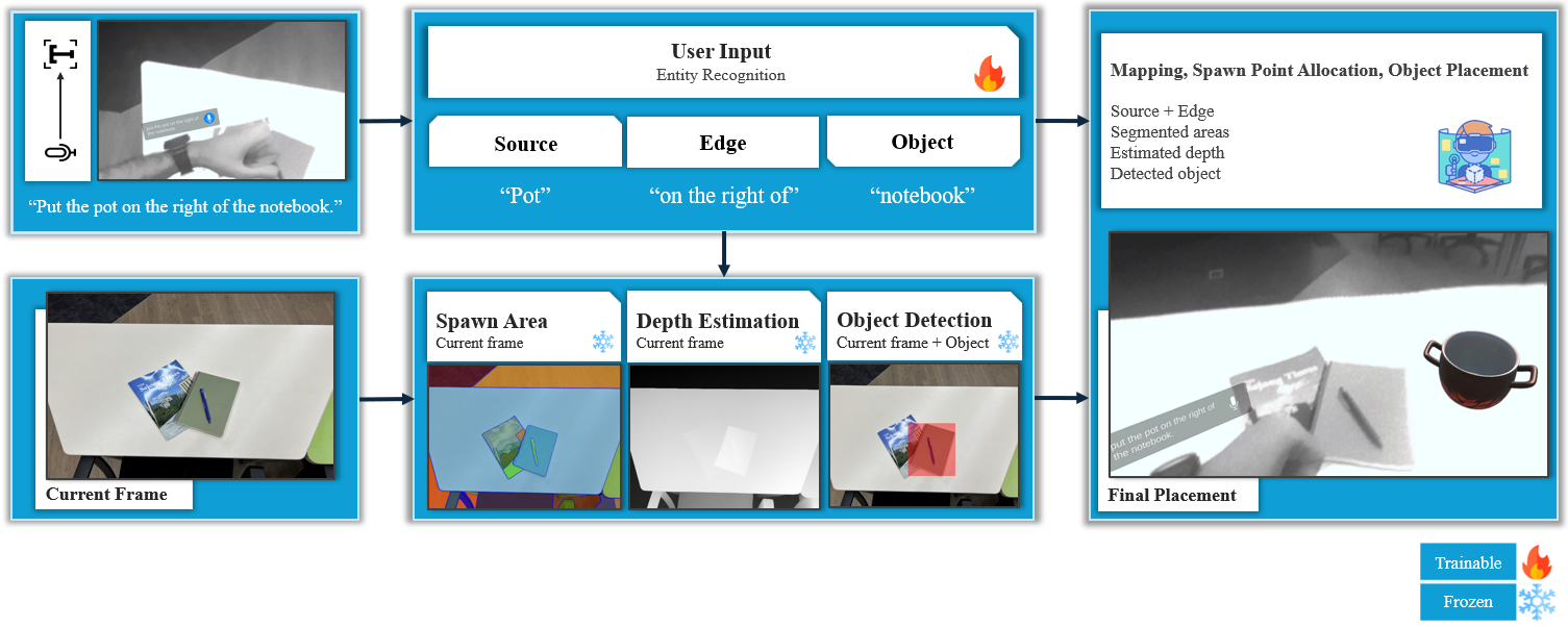 The pipeline employs entity recognition, object detection, depth estimation along with spawn area allocation to create a placement system.